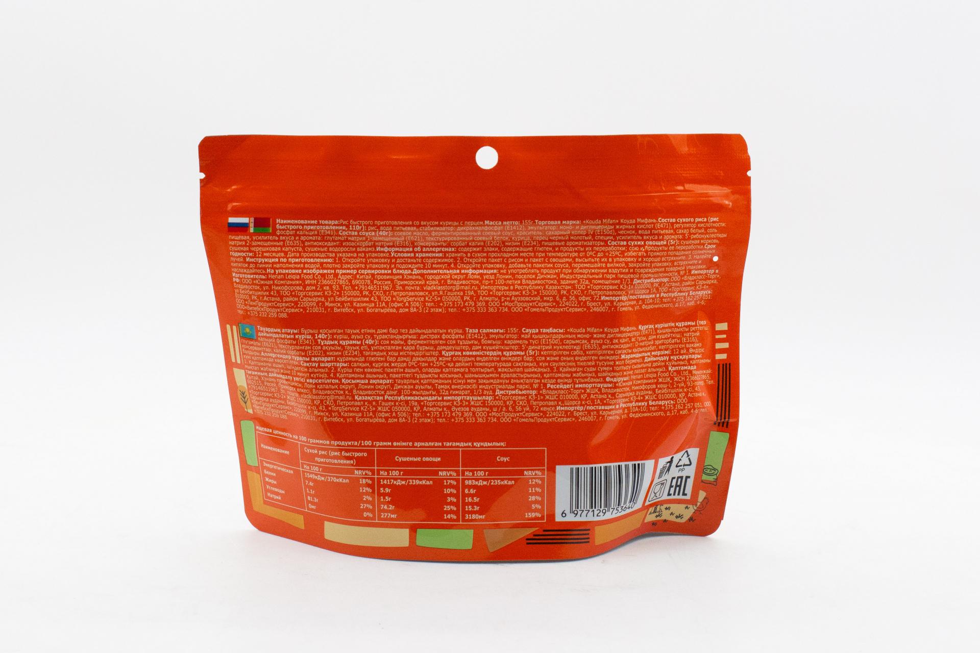 Рис быстрого приготовления Kouda Mifan со вкусом курицы с перцем (Китай) 155г80,64 руб. за штуку (в упак. 50 шт.) |